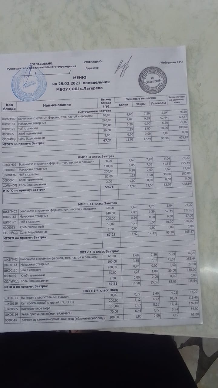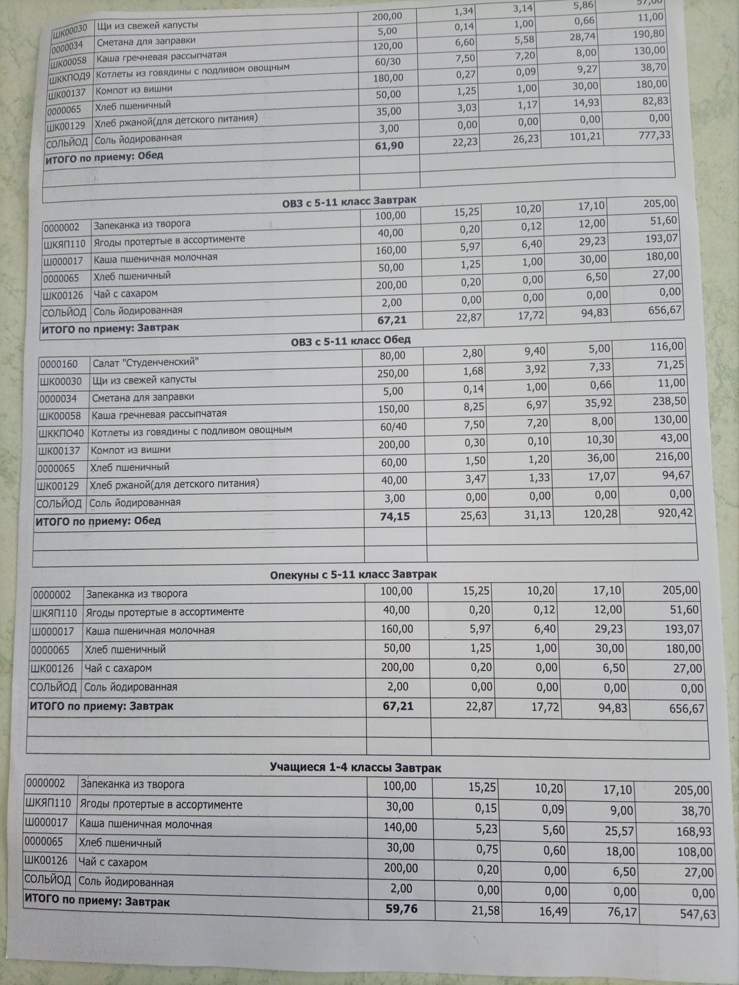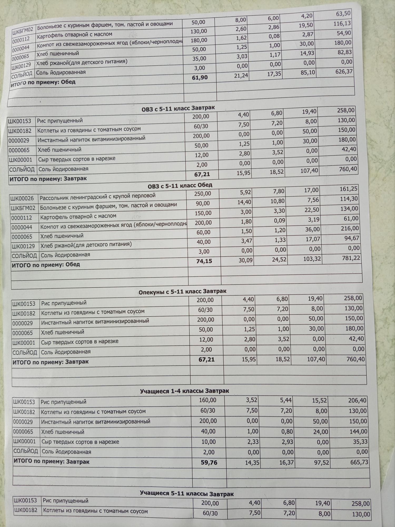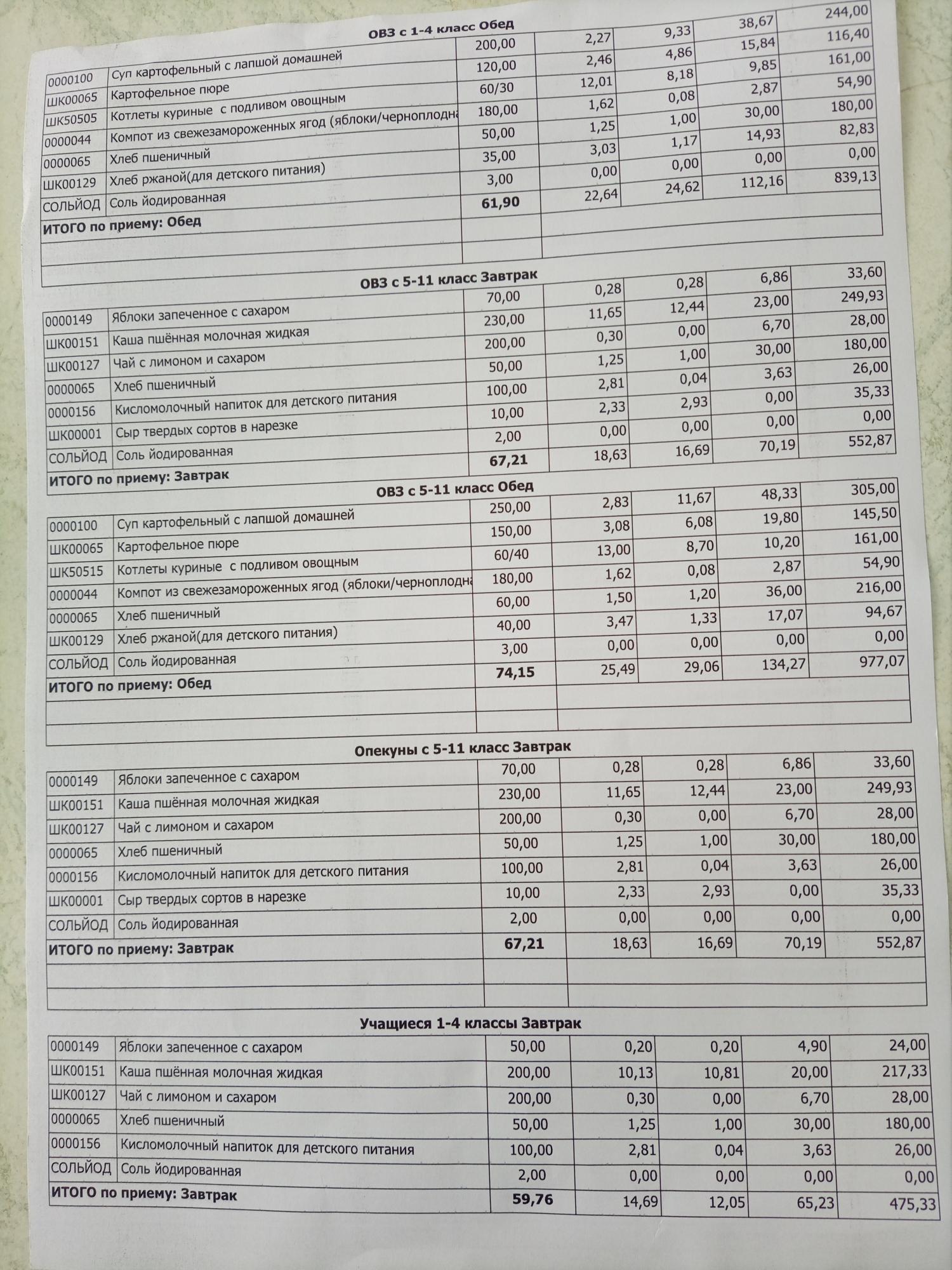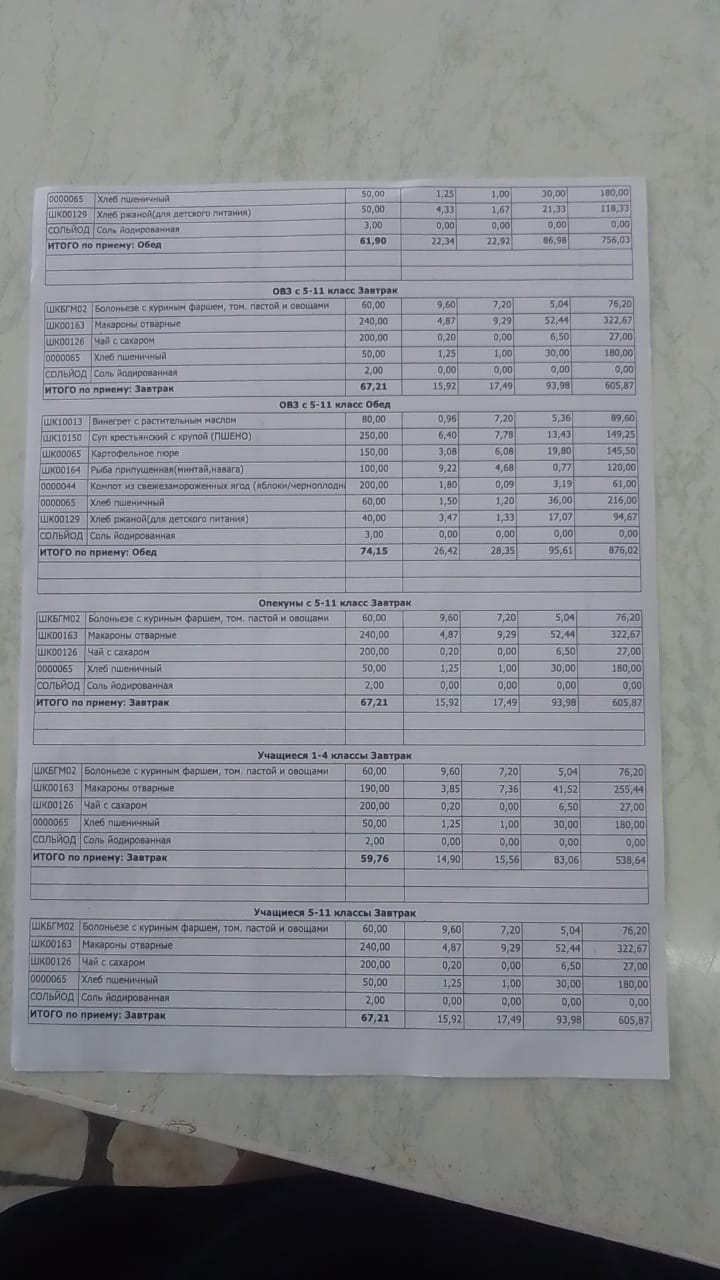 Основное 2-х недельное меню школа