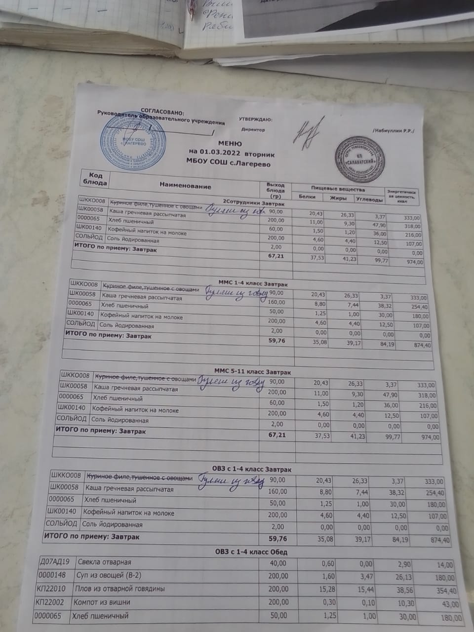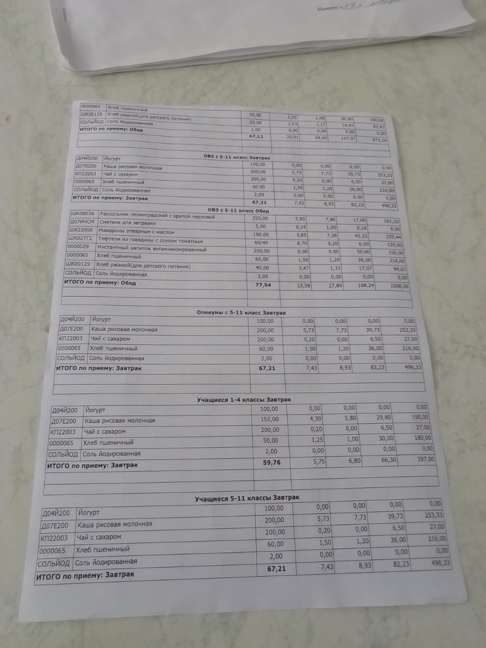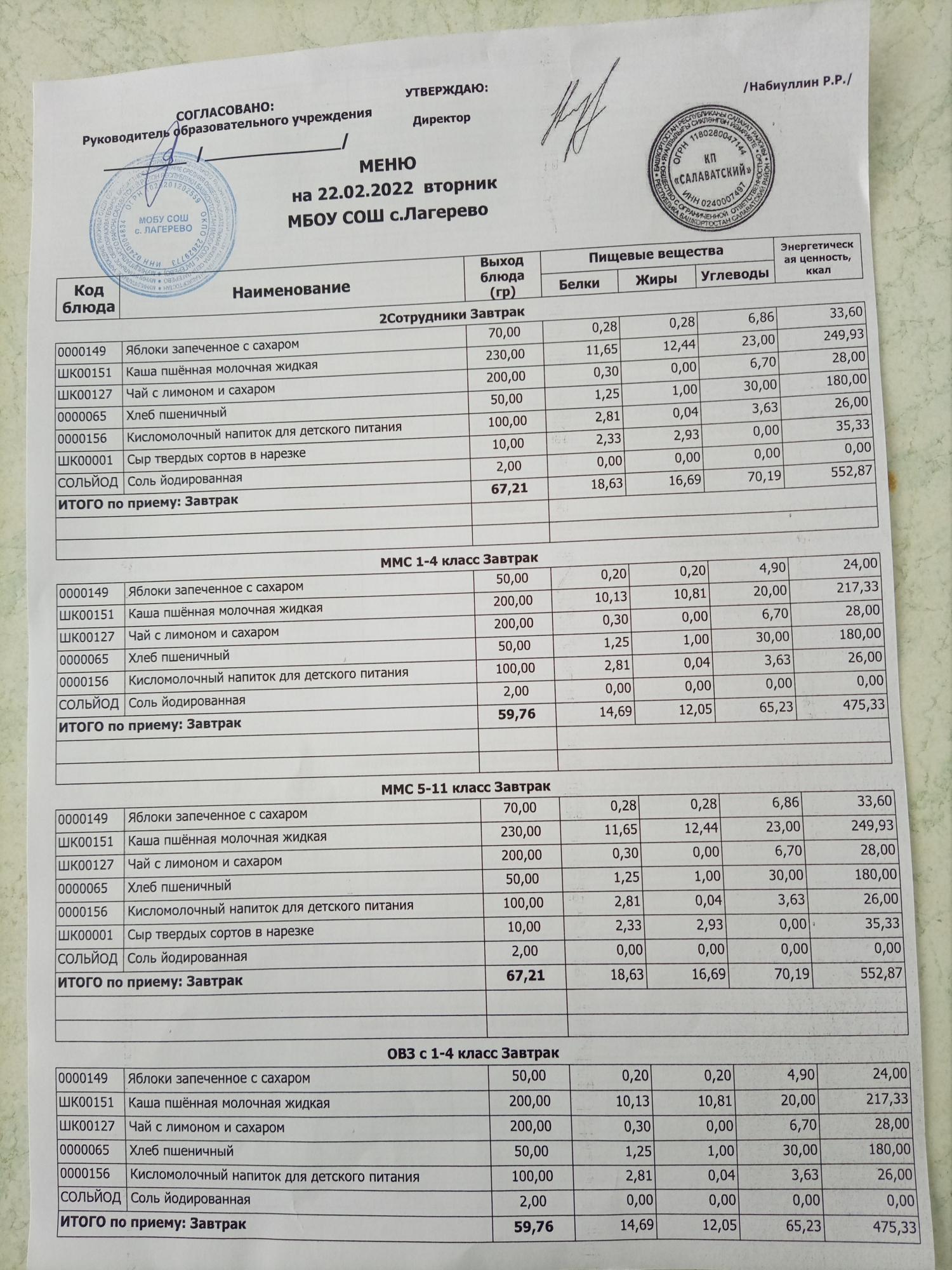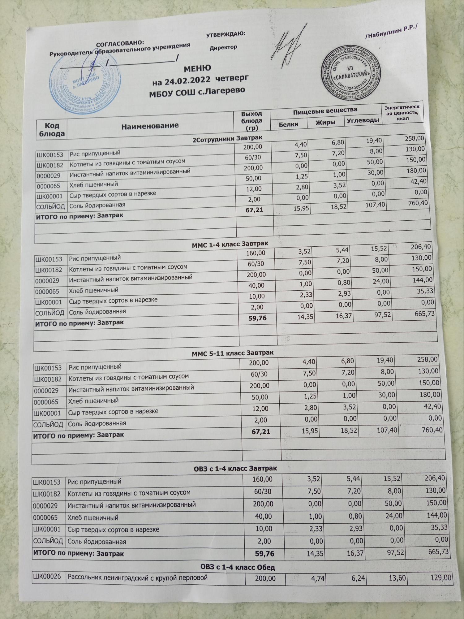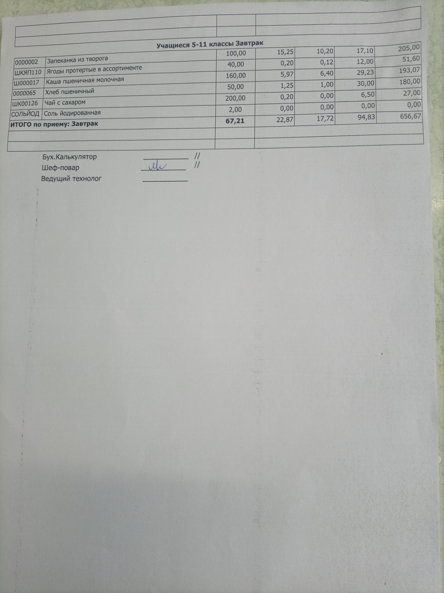 Основное 2-х недельное меню школа